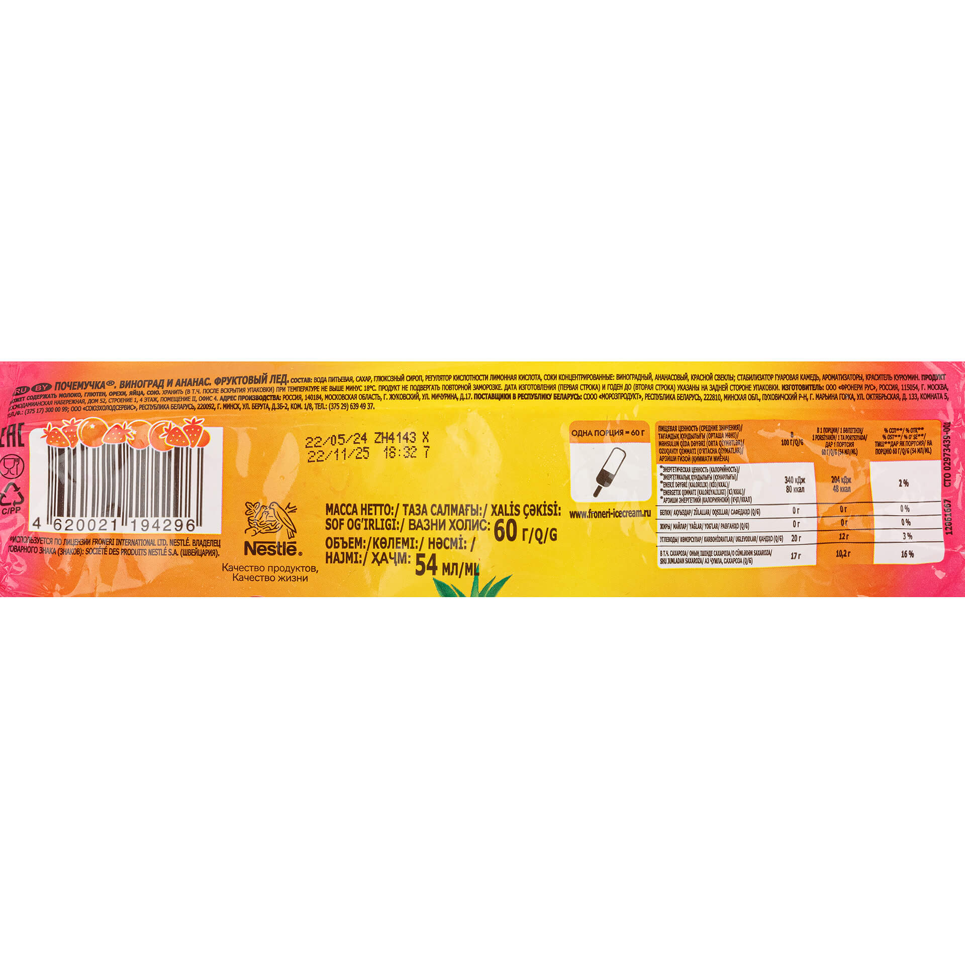 Фруктовый лед с виноградом и ананасом Почемучка 60 г