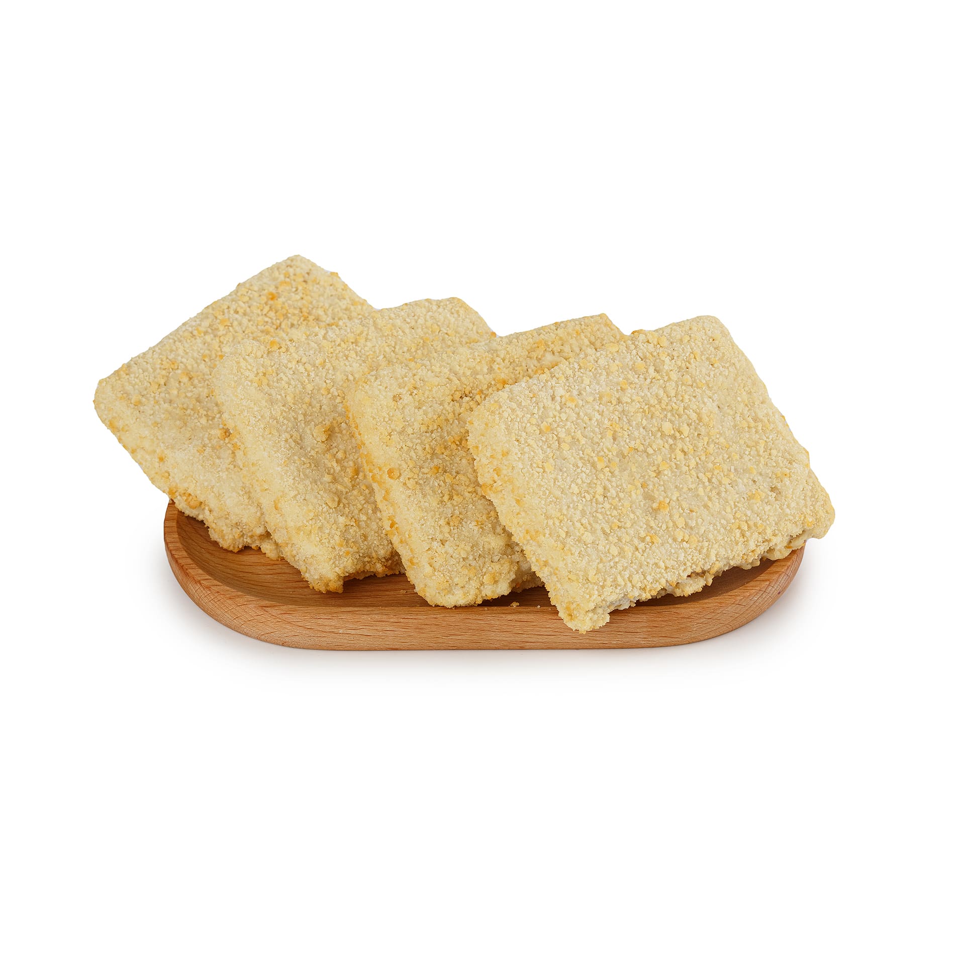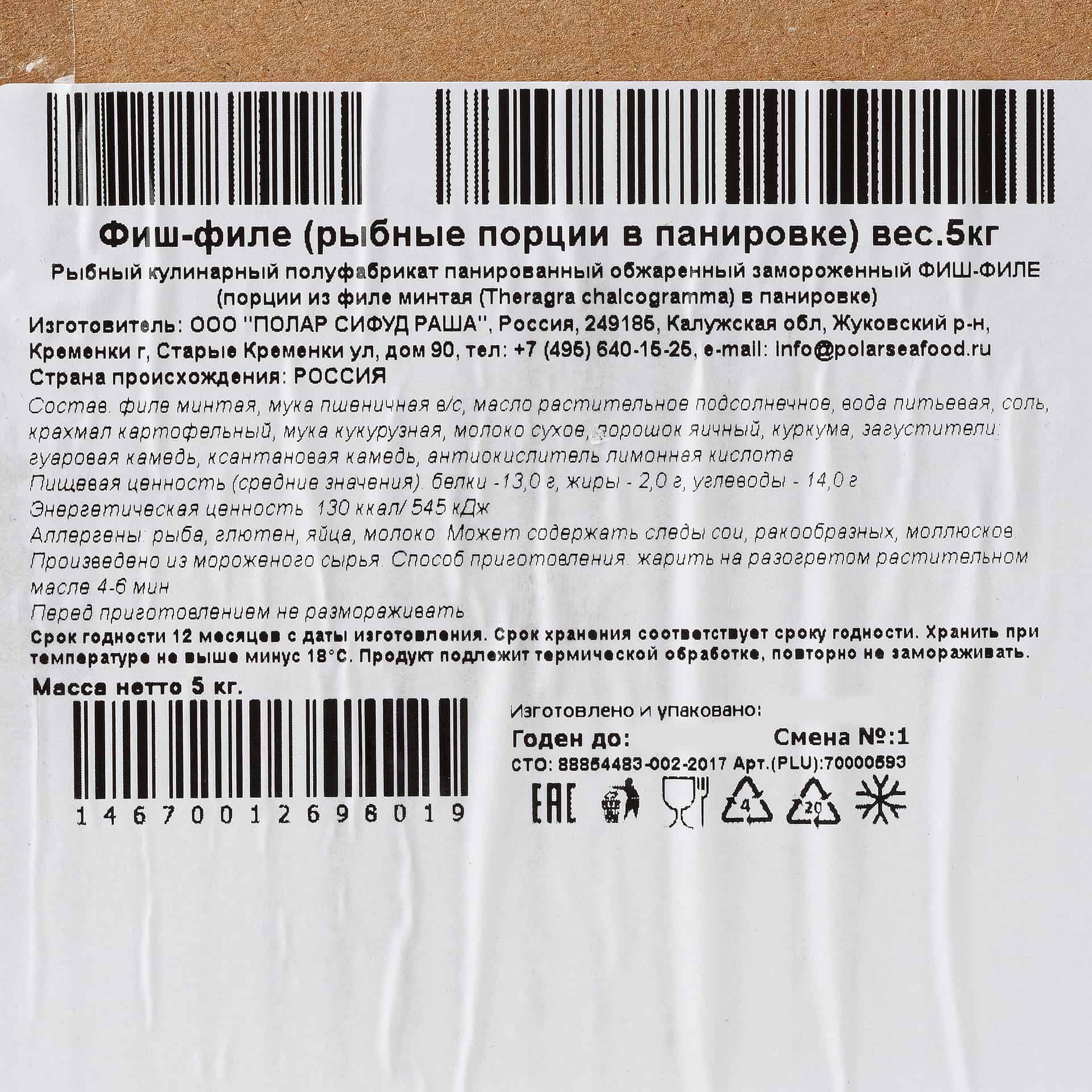 Состав: филе минтая, мука пшеничная высшего сорта, масло растительное подсолнечное, вода питьевая, соль, крахмал картофельный, мука кукурузная, молоко сухое, порошок яичный, куркума, загустители (гуаровая камедь, ксантановая камедь), антиокислитель лимонная кислота.