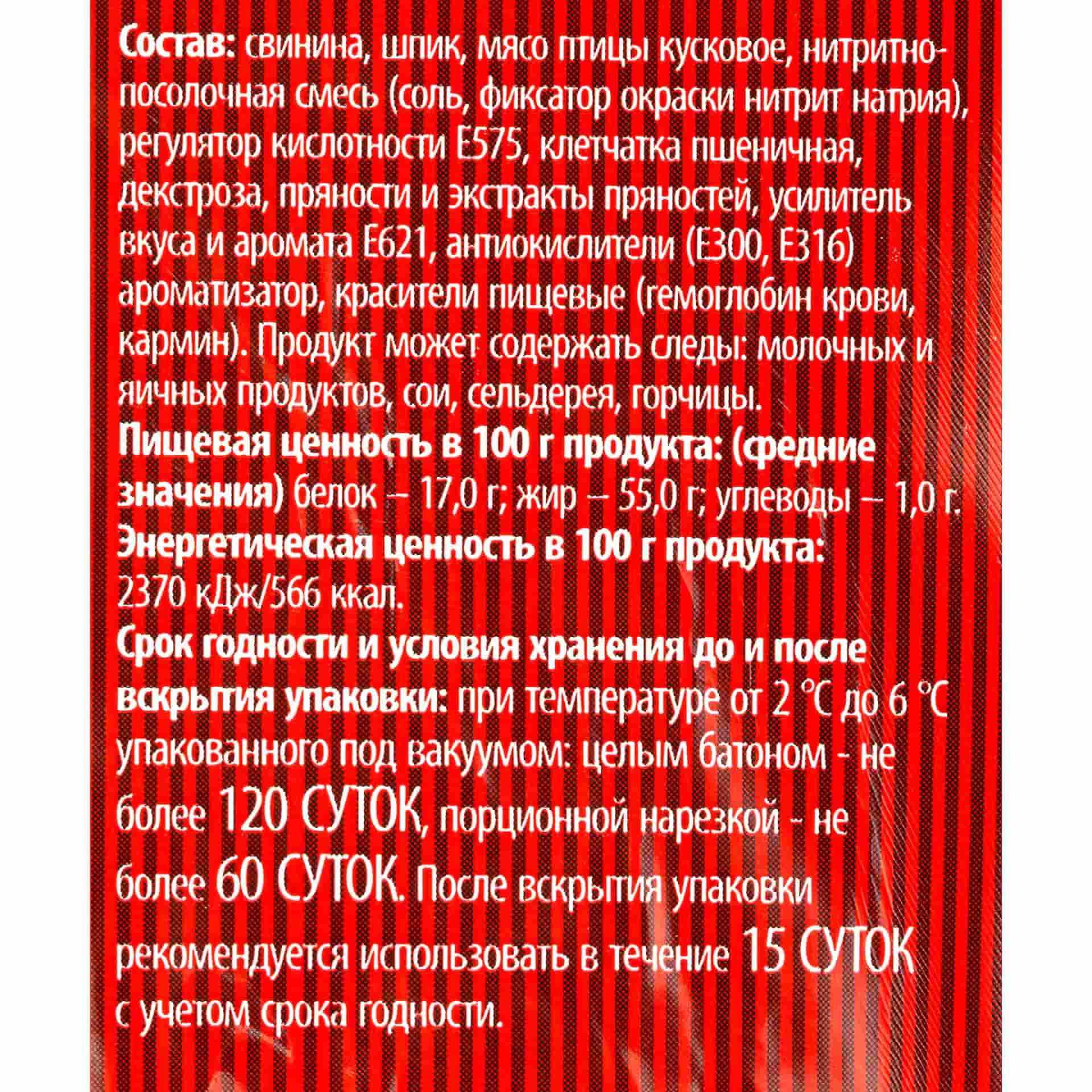 Состав: свинина, шпик, мясо птицы кусковое, нитритно-посолочная смесь (соль, фиксатор окраски нитрит натрия), регулятор кислотности E575, клетчатка пшеничная, декстроза, пряности и экстракты пряностей, усилитель вкуса и аромата E621, антиокислители (E300, E316), ароматизатор, красители пищевые (гемоглобин крови, кармин).