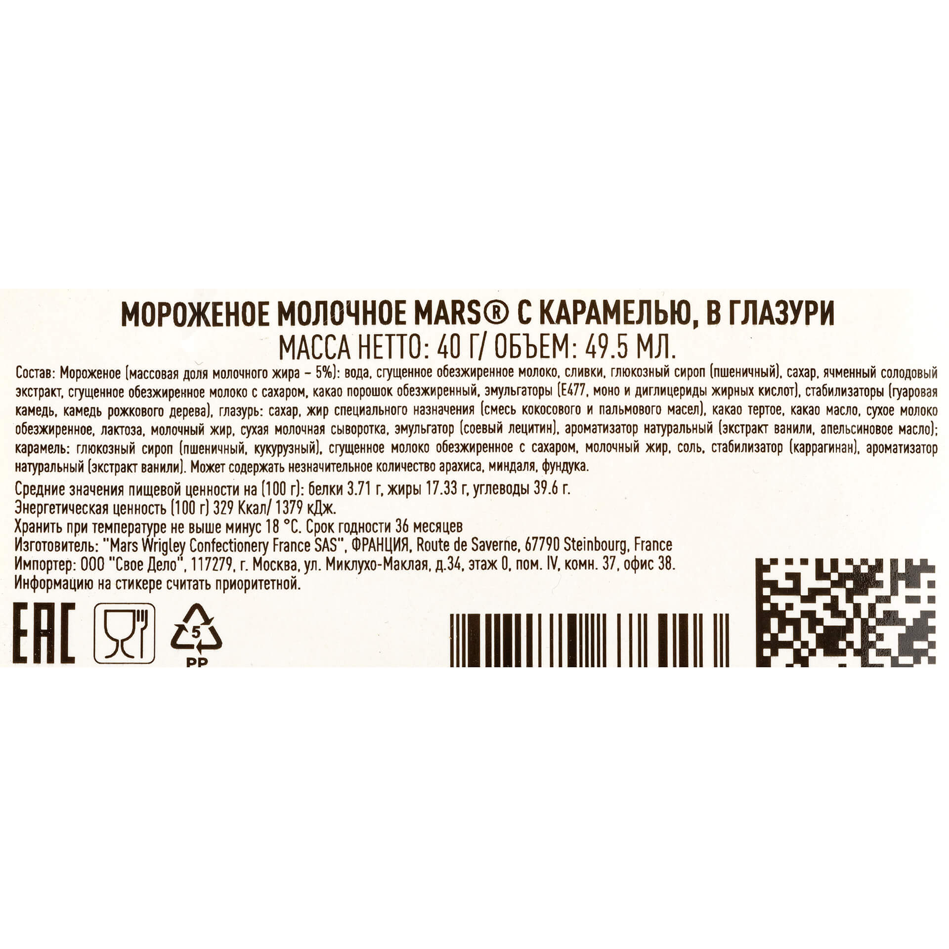 Состав: мороженое (массовая доля молочного жира — 5%): вода, сгущенное обезжиренное молоко, сливки, глюкозный сироп (пшеничный), сахар, ячменный солодовый экстракт, сгущенное обезжиренное молоко с сахаром, какао порошок обезжиренный, эмульгаторы (E477, моно- и диглицериды жирных кислот), стабилизаторы (гуаровая камедь, камедь рожкового дерева); глазурь: сахар, жир специального назначения (смесь кокосового и пальмового масел), какао тёртое, какао масло, сухое молоко обезжиренное, лактоза, молочный жир, сухая молочная сыворотка, эмульгатор (соевый лецитин), ароматизатор натуральный (экстракт ванили, апельсиновое масло); карамель: глюкозный сироп (пшеничный, кукурузный), сгущенное молоко обезжиренное с сахаром, молочный жир, соль, стабилизаторы (каррагинан), ароматизатор натуральный (экстракт ванили).