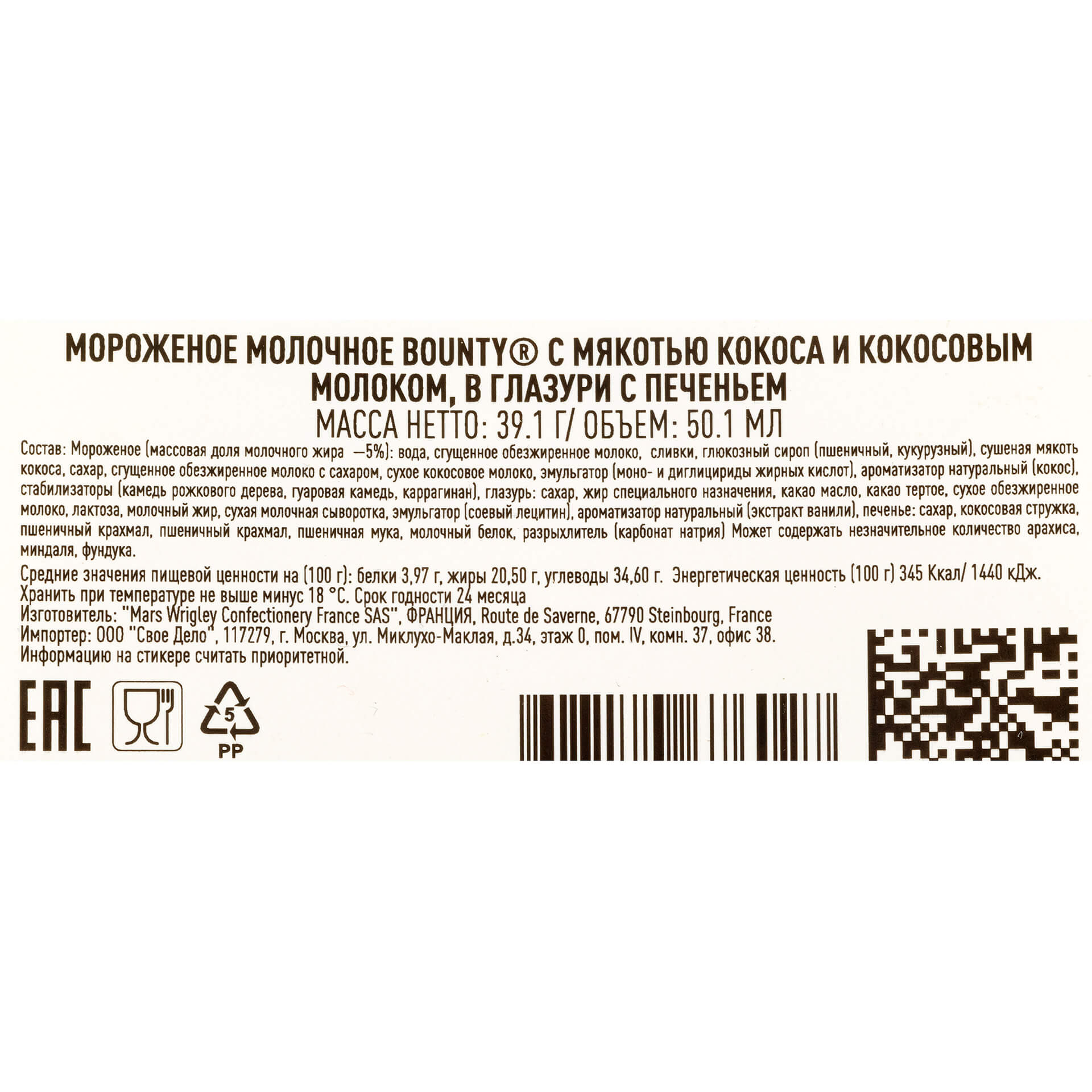 Мороженое молочное с кокосом и кокосовым молоком в глазури с печеньем "Баунти" батончик Bounty 39,1 г