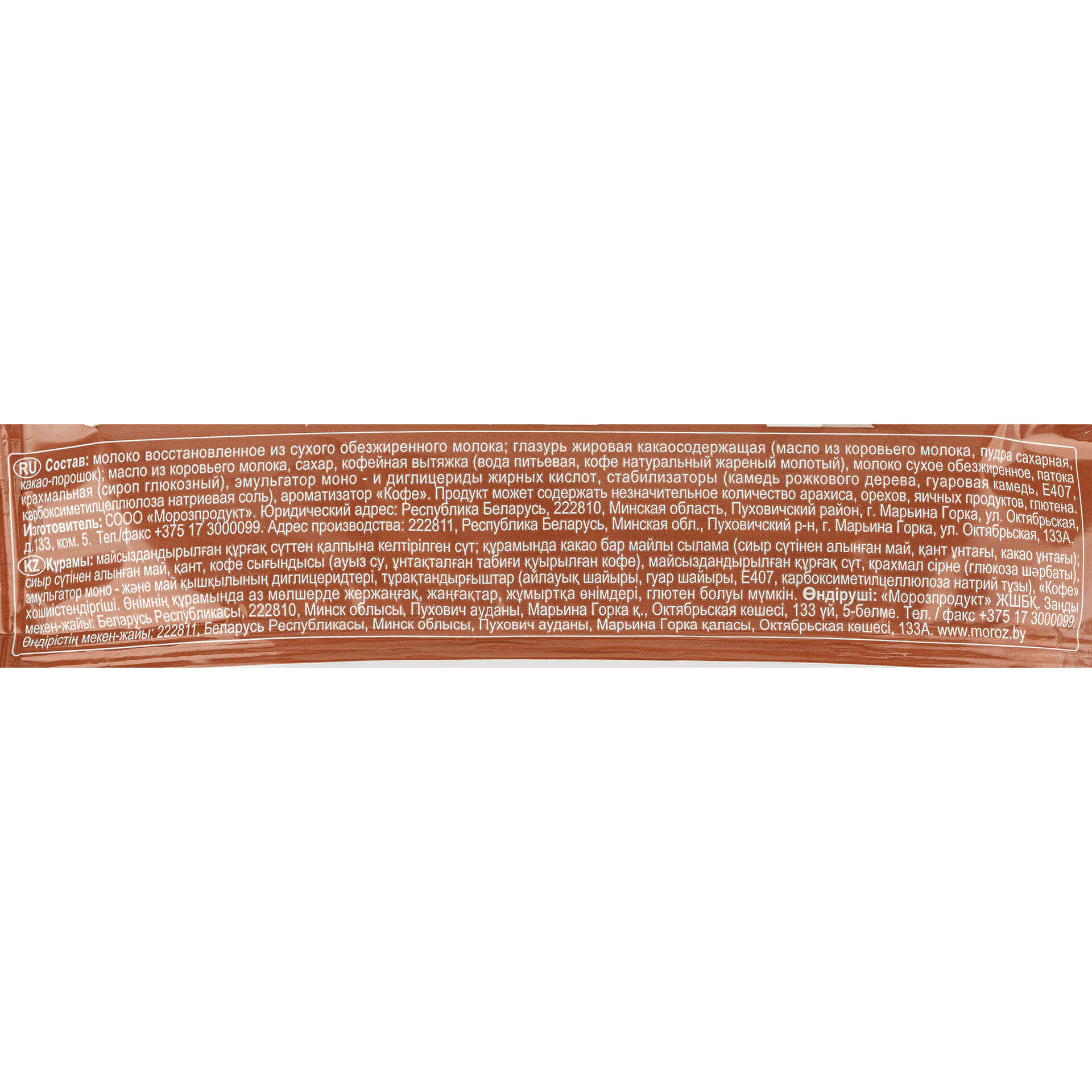 Молоко восстановленное из сухого обезжиренного молока; глазурь жировая какаосодержащая (масло из коровьего молока, пудра сахарная, какао-порошок); масло из коровьего молока, сахар, кофейная вытяжка (вода питьевая, кофе натуральный жареный молотый), молоко сухое обезжиренное, патока крахмальная (сироп глюкозный), эмульгатор моно- и диглицериды жирных кислот, стабилизаторы (камедь рожкового дерева, гуаровая камедь, E407, карбоксиметилцеллюлоза натриевая соль), ароматизатор «Кофе».