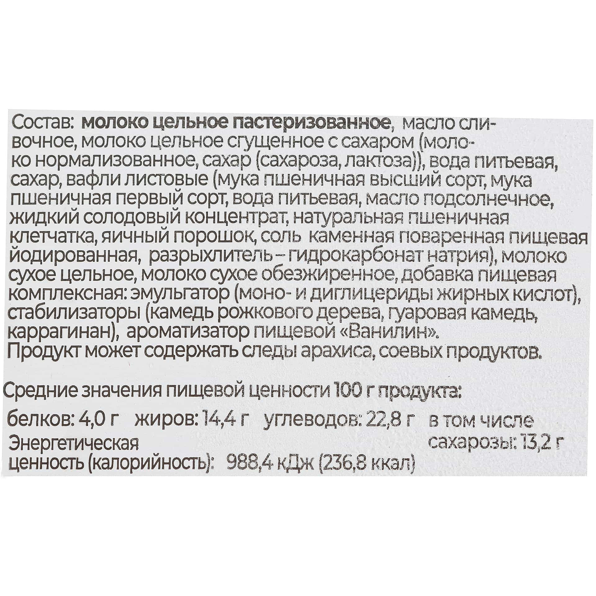 Молоко цельное пастеризованное, масло сливочное, молоко цельное сгущенное с с ахаром (молоко нормализованное, сахар (сахароза, лактоза)), вода питьевая, сахар, вафли листовые (мука пшеничная высший сорт, мука пшеничная первый сорт, вода питьевая, масло подсолнечное, жидкий солодовый концентрат, натуральная пшеничная клетчатка, яичный порошок, соль каменная поваренная пищевая йодированная, разрыхлитель-гидрокарбонат натрия), молоко сухое цельное, молоко сухое обезжиренное, добавка пищевая комплексная: эмульгатор (моно-и диглецериды жирных кислот), стабилизаторы (камедь рожкового дерева, гуаровая камедь, каррагинан), ароматизатор пищевой «Ванилин». Продукт может содержать следы арахиса, соевых продуктов.