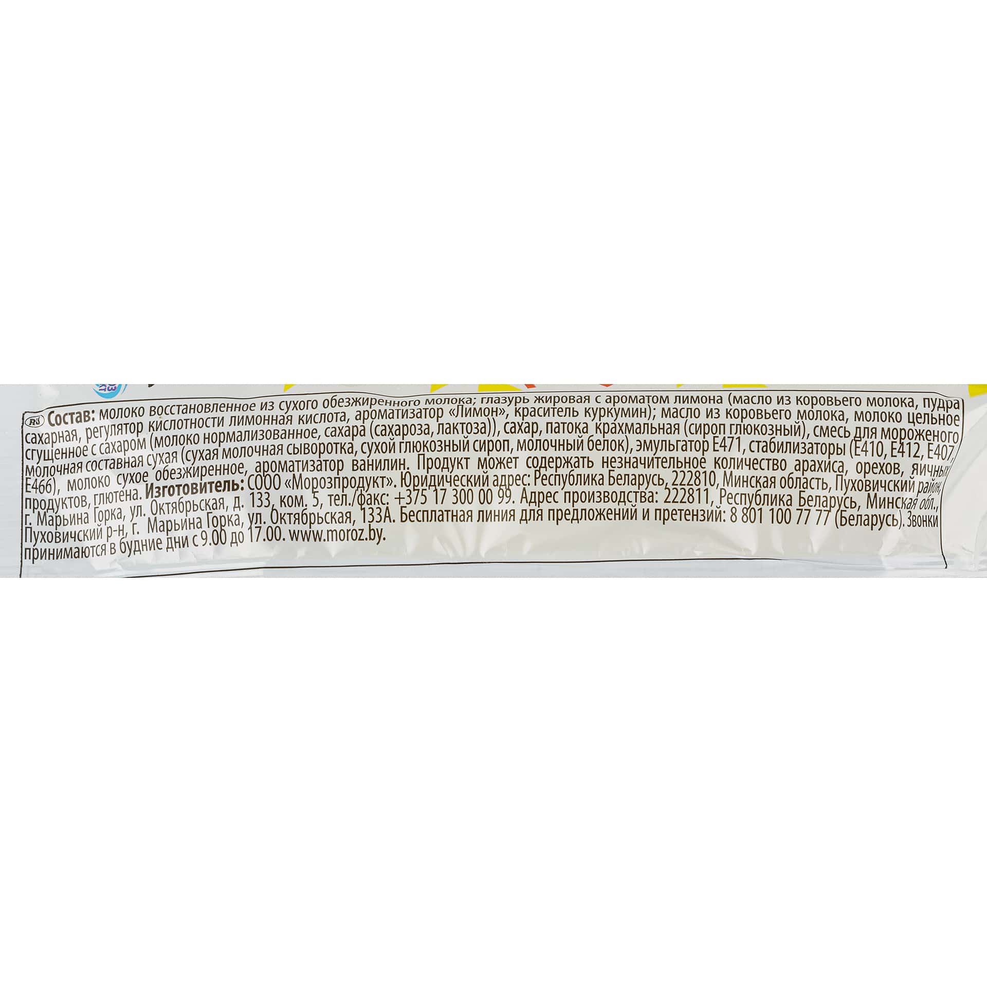 Молоко восстановленное из сухого обезжиренного молока; глазурь жировая с ароматом лимона (масло из коровьего молока, пудра сахарная, жир специального назначения (рафинированные дезодорированные модифицированные растительные масла: масло пальмовое, эмульгаторы (Е471, лецитин соевый), антиокислитель лимонная кислота), регулятор кислотности лимонная кислота, ароматизатор «Лимон», краситель куркумин); масло из коровьего молока, молоко цельное сгущенное с сахаром (молоко нормализованное, сахара (сахароза, лактоза)), сахар, молоко сухое обезжиренное, эмульгатор моно- и диглицериды жирных кислот, стабилизаторы (камедь рожкового дерева, гуаровая камедь, каррагинан, карбоксиметилцеллюлоза натриевая соль), ароматизатор ванилин. Продукт может содержать незначительное количество арахиса, орехов, яичных продуктов, глютена.