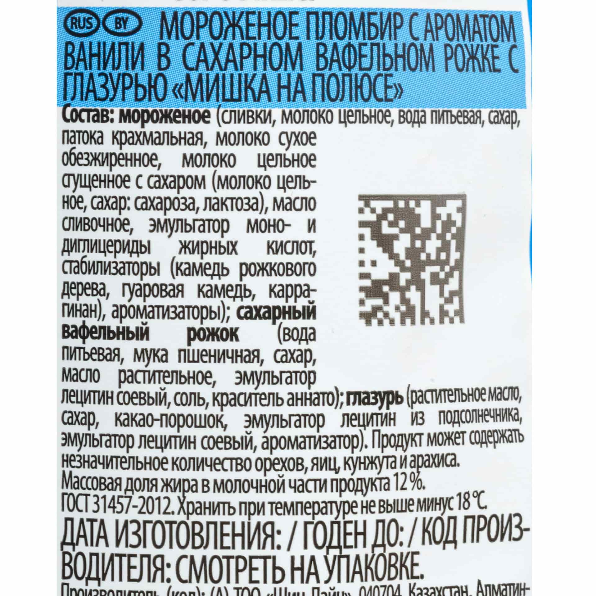 Состав: мороженое (сливки, молоко цельное, вода питьевая, сахар, патока крахмальная, молок сухое обезжиренное, молоко цельное сгущенное с сахаром (молоко цельное, сахар: сахароза, лактоза), масло сливочное, эмульгатор моно- и диглицериды жирных кислот, стабилизаторы (камедь рожкового дерева, гуаровая камедь, каррагинан), ароматизаторы); сахарный вафельный рожок (вода питьевая, мука пшеничная, сахар, масло растительное, эмульгатор лецитин соевый, соль, краситель аннато); глазурь (растительное масло, сахар, какао-порошок, эмульгатор лецитин из подсолнечника, эмульгатор лецитин соевый, ароматизатор).