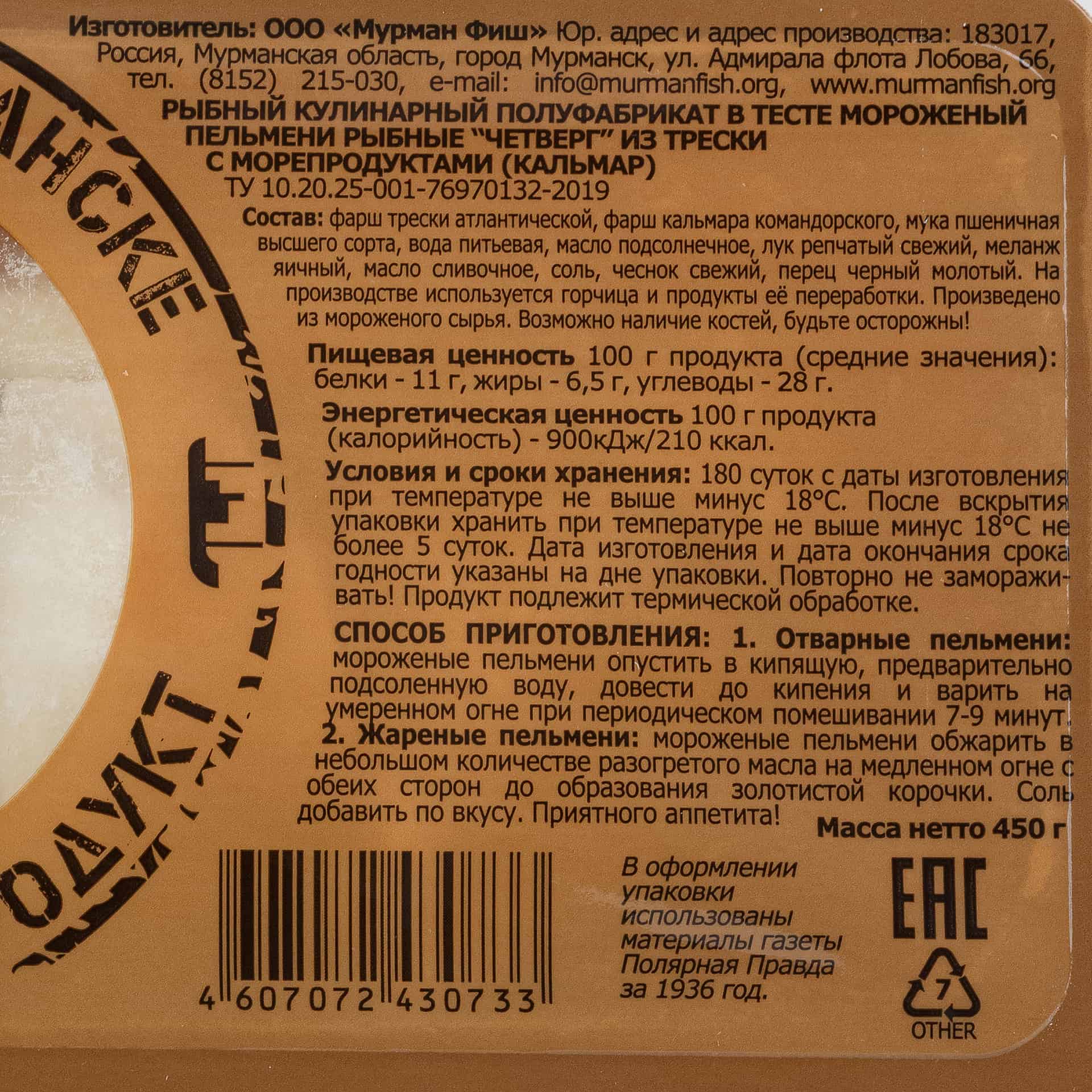 Пельмени рыбные из трески с кальмаром "Четверг" полуфабрикат замороженный Мурманфиш 450 г