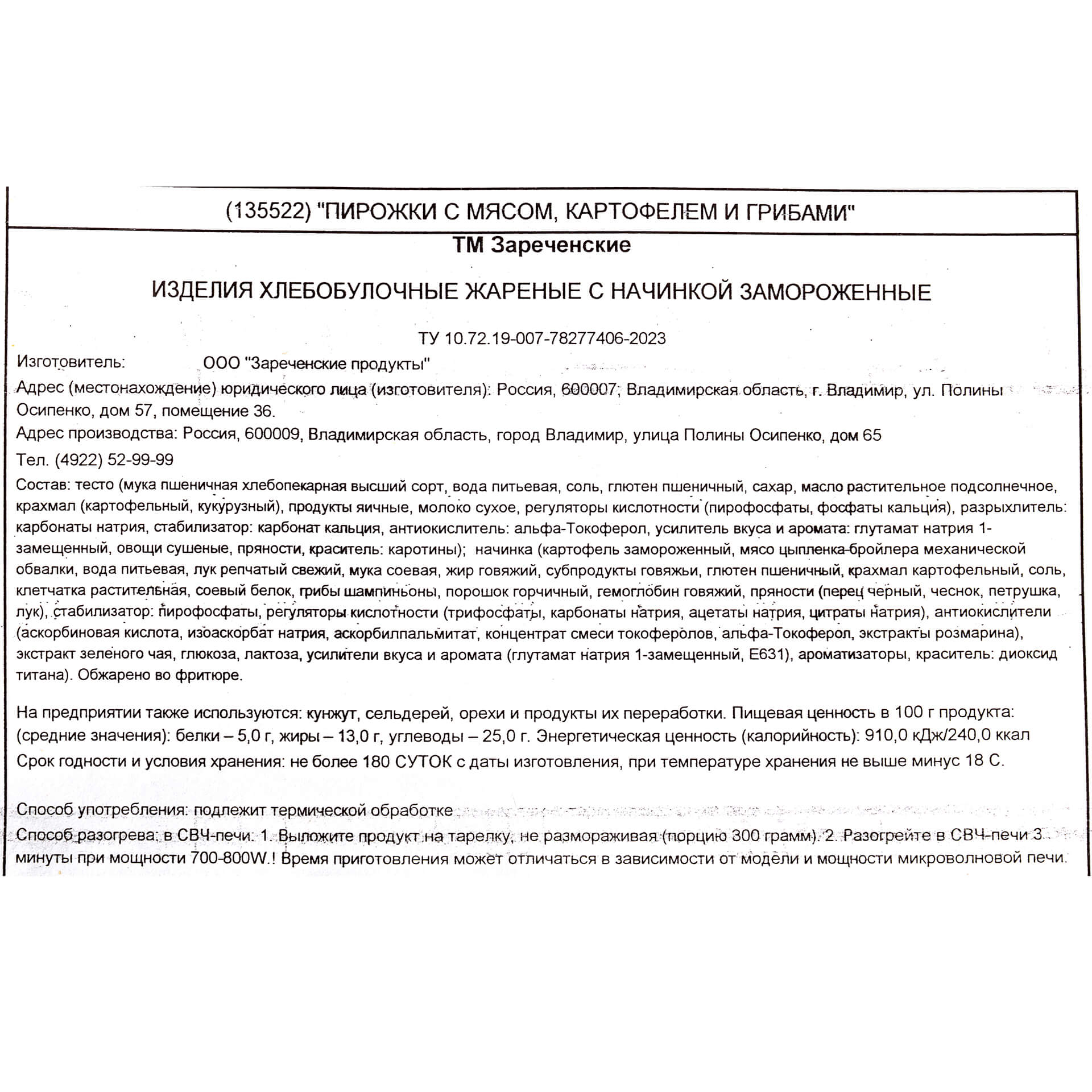 Состав: тесто (мука пшеничная хлебопекарная высший сорт, вода питьевая, соль, глютен пшеничный, сахар, масло растительное подсолнечное, крахмал (картофельный, кукурузный), продукты яичные, молоко сухое, регуляторы кислотности (пирофосфаты, фосфаты кальция), разрыхлитель (карбонаты натрия), стабилизатор (карбонат кальция), антиокислитель (альфа-Токоферол), усилитель вкуса и аромата (глутамат натрия 1-замещённый), овощи сушёные, пряности, краситель (каротины)); начинка (картофель замороженный, мясо цыплёнка-бройлера механической обвалки, вода питьевая, лук репчатый свежий, мука соевая, жир говяжий, субпродукты говяжьи, глютен пшеничный, крахмал картофельный, соль, клетчатка растительная, соевый белок, грибы шампиньоны, порошок горчичный, гемоглобин говяжий, пряности (перец чёрный, чеснок, петрушка, лук), стабилизатор (пирофосфаты), регуляторы кислотности (трифосфаты, карбонаты натрия, ацетаты натрия, цитраты натрия), антиокислители (аскорбиновая кислота, изоаскорбат натрия, аскорбилпальмитат, концентрат смеси токоферолов, альфа-Токоферол, экстракты розмарина), экстракт зелёного чая, глюкоза, лактоза, усилители вкуса и аромата (глутамат натрия 1-замещённый, E631), ароматизаторы, краситель (диоксид титана)).