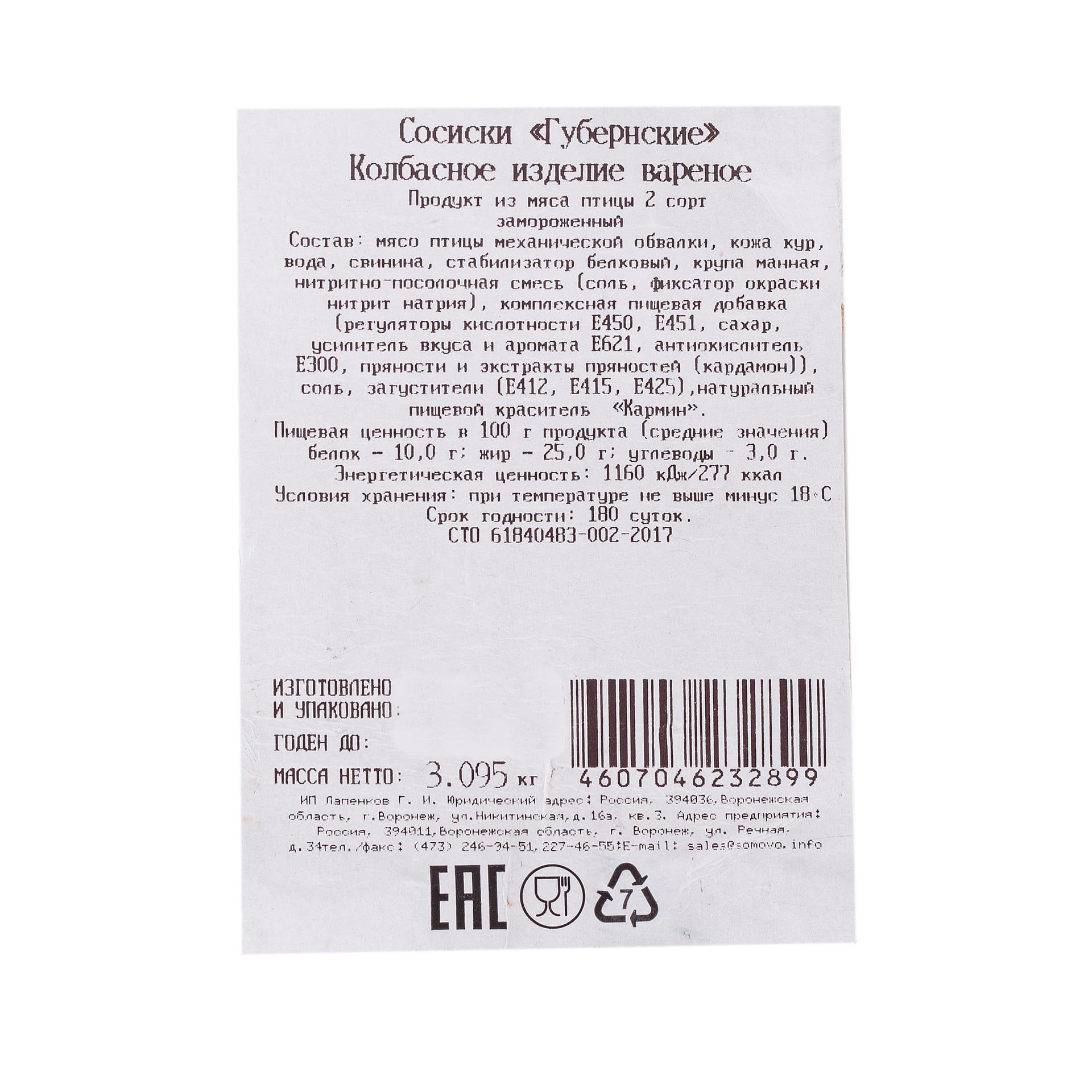 Сосиски из мяса птицы и свинины "Губернские" полуфабрикат замороженный Сомовомясопродукт 3 кг