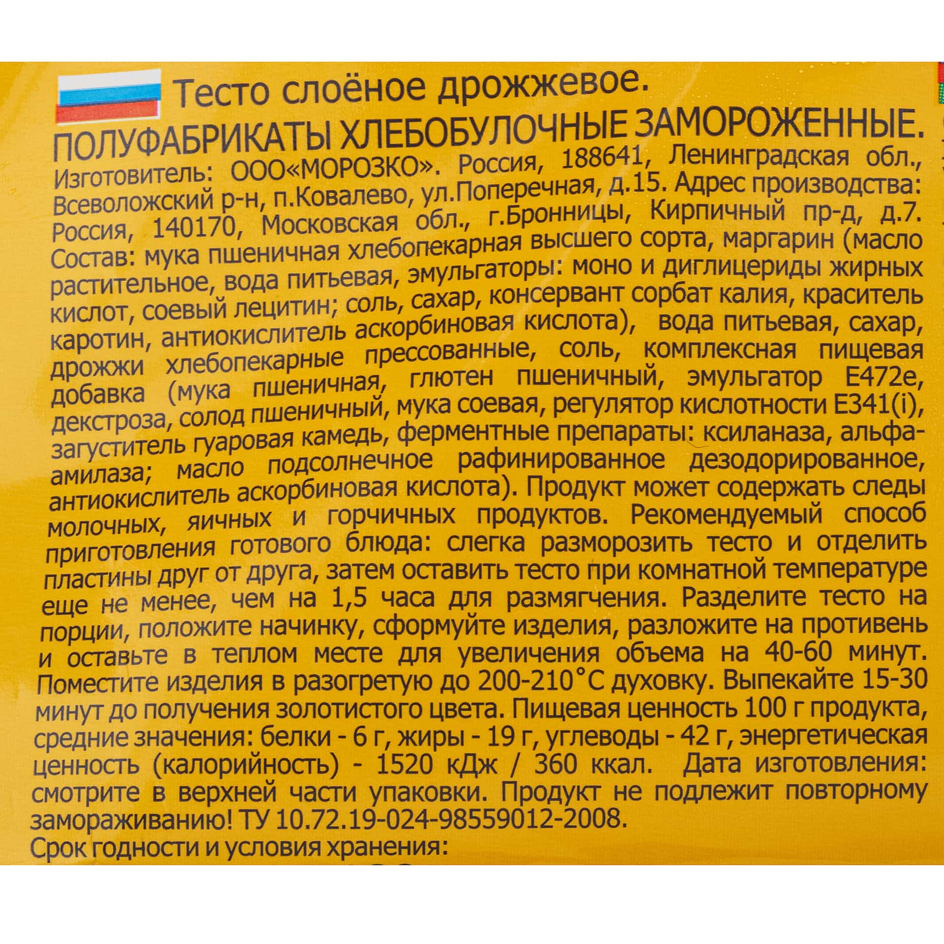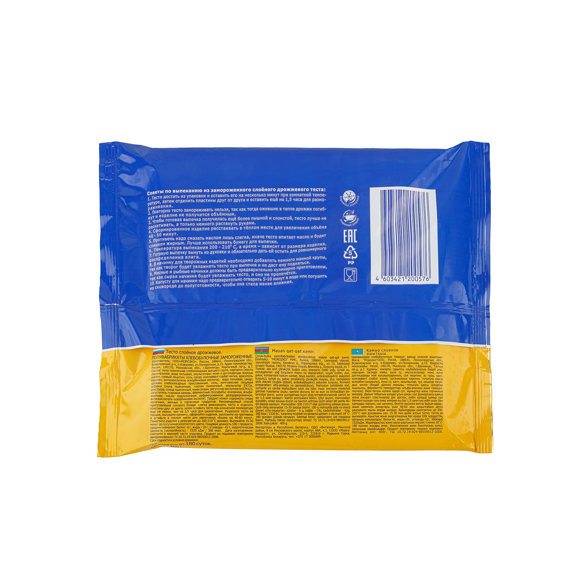 Тесто слоеное дрожжевое в пластинах полуфабрикат замороженный Морозко 400 г
